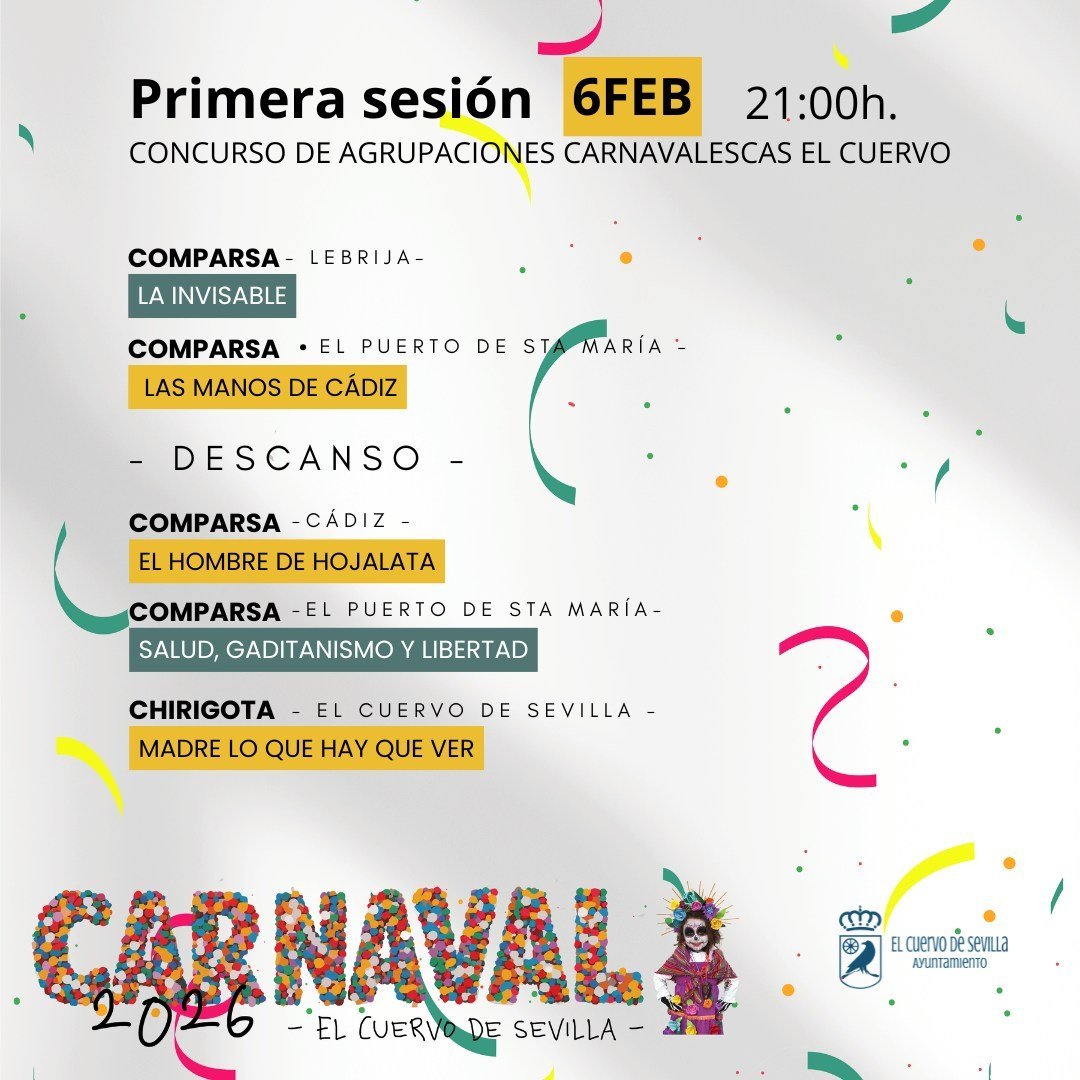 El Concurso de Agrupaciones Carnavalescas de El Cuervo de Sevilla (CACEC) da el pistoletazo de salida a su primera fase con dos sesiones consecutivas, los días 6 y 7 de febrero, en las que se subirán al escenario doce agrupaciones entre comparsas y chirigotas procedentes tanto de la localidad anfitr