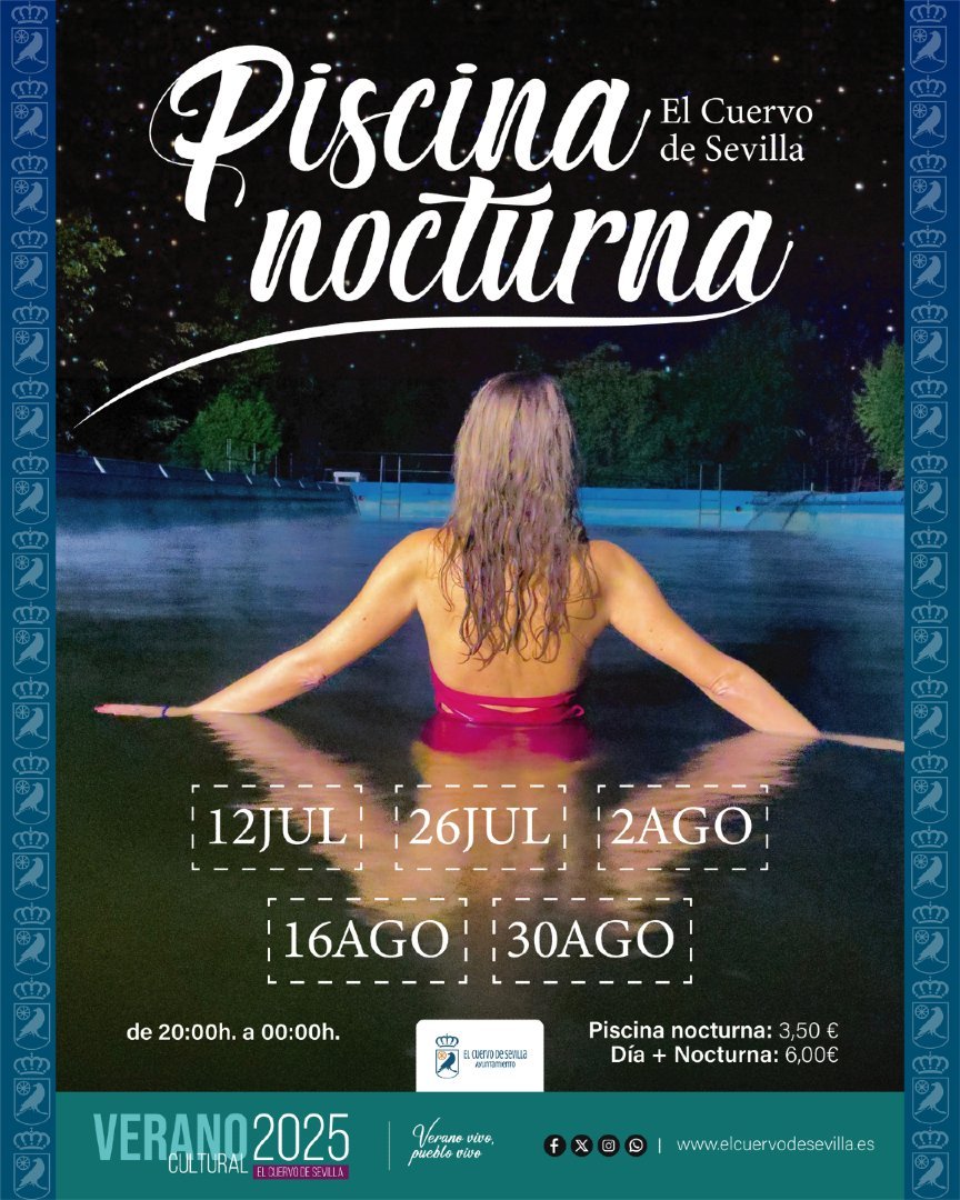 El Ayuntamiento de El Cuervo de Sevilla ha anunciado las fechas en las que se celebrarán las sesiones de piscina nocturna durante el verano de 2025. La actividad se desarrollará en las instalaciones municipales en horario de 20:00 a 00:00 horas. Las jornadas previstas tendrán lugar los días 12 y 26